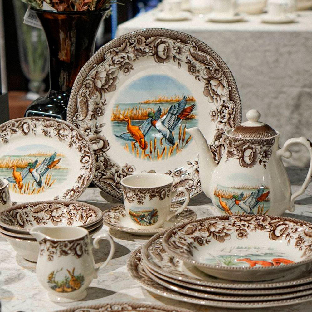Великолепная серия фаянсовых изделий с узорами флоры по краям и живописными лесными животными в центре. Коллекция Haydon Grove от Grace Tudor