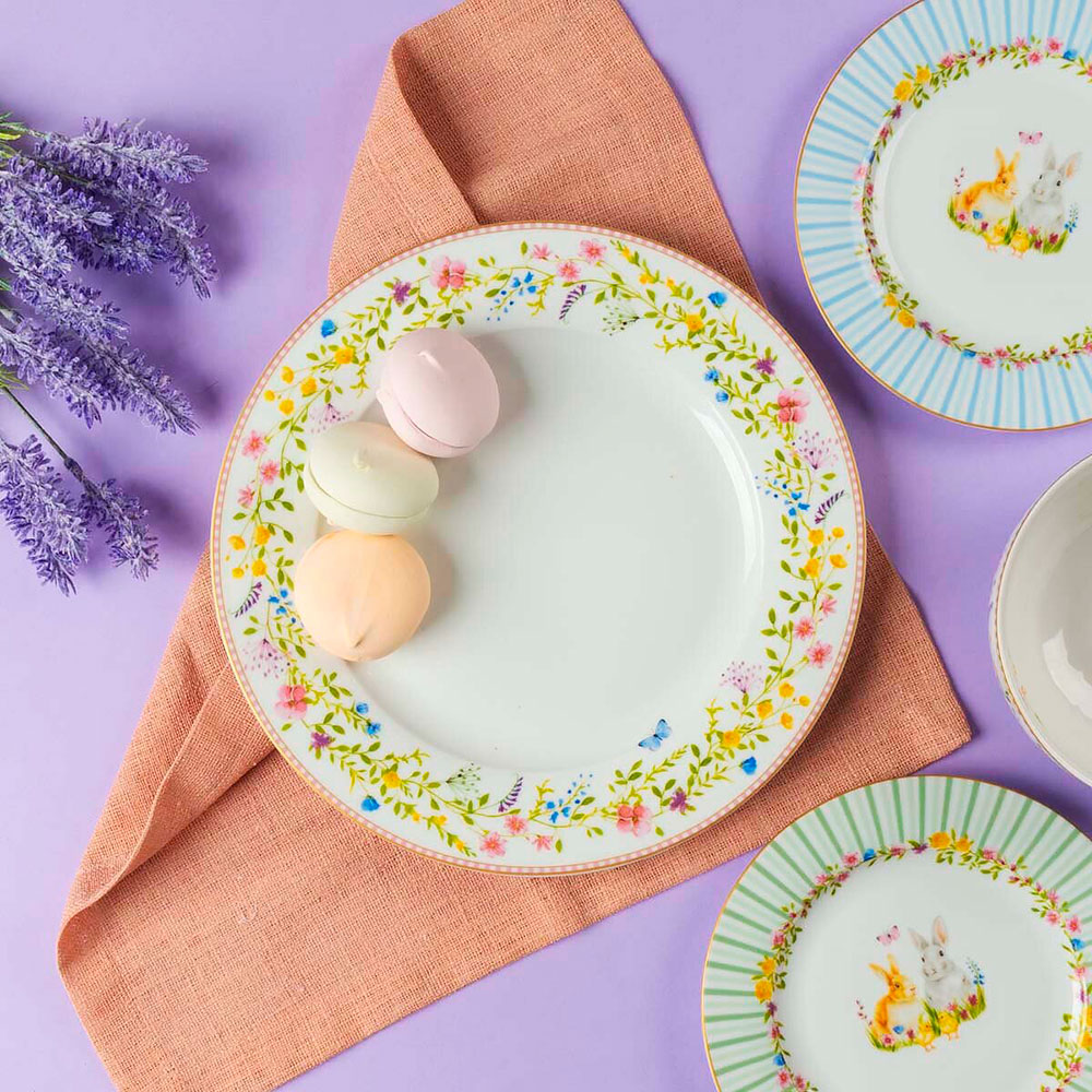 Пасхальная коллекция фарфоровой посуды с рисунками пушистых кроликов, полевых цветов и бабочек. Бренд Easy Life