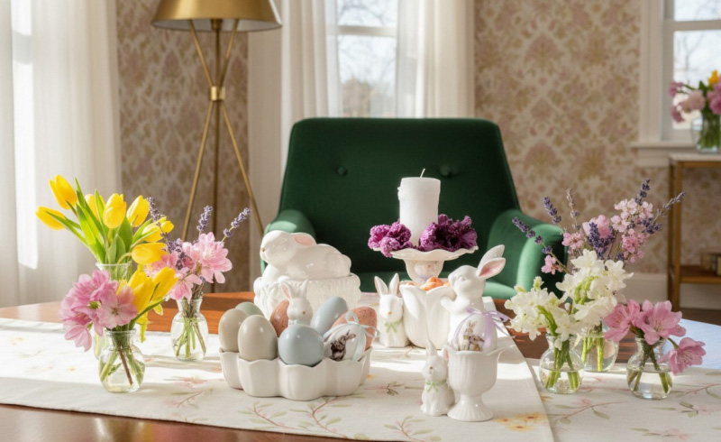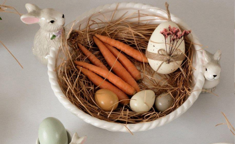 На тарелках зайцы словно замерли среди свежих первоцветов, а натуралистичная текстура кроликов и нежные росписи полевых цветов выглядят так живо, будто только что принесены из сада. Матовый фарфор и керамика звучат спокойно и чисто. В этой сервировке нет броского блеска — только подлинная душевность и светлая пасхальная радость.