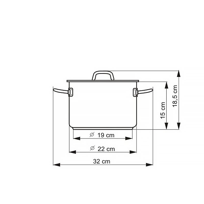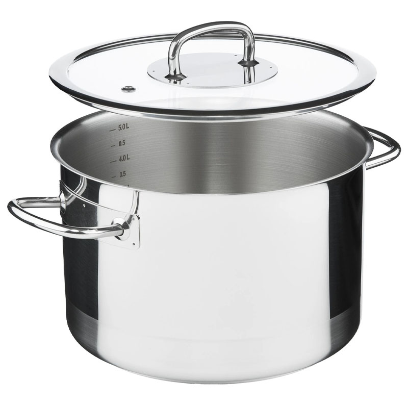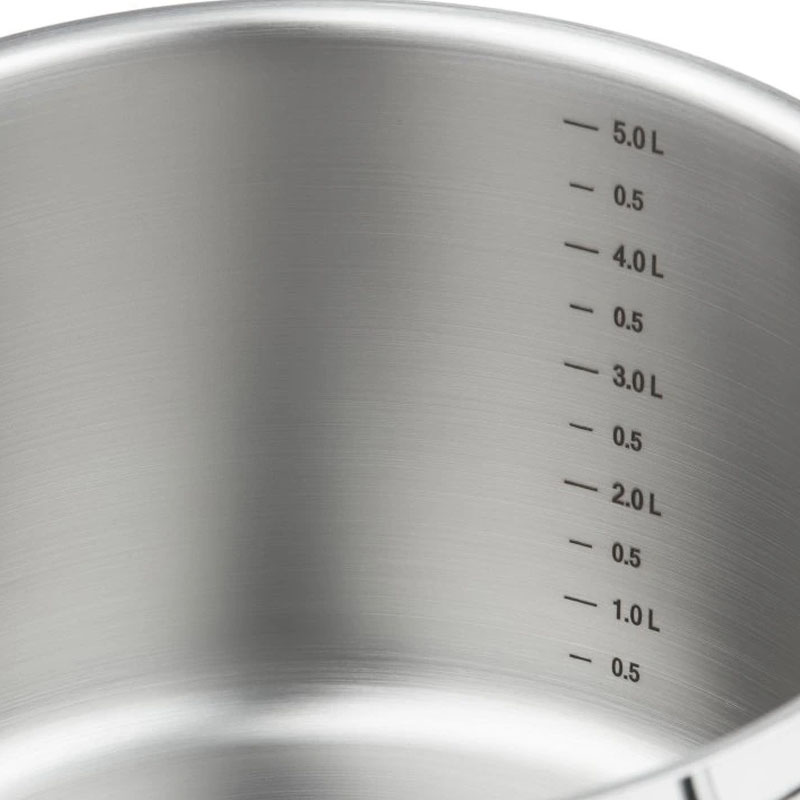 - 5-слойное капсульное дно (3 мм). Сердцевина из алюминия, запаянная между слоями стали, удерживает тепло ещё 10 минут после выключения плиты для томления без энергии.