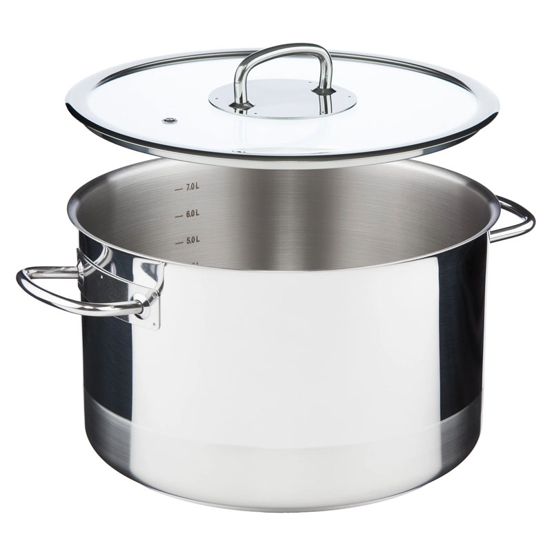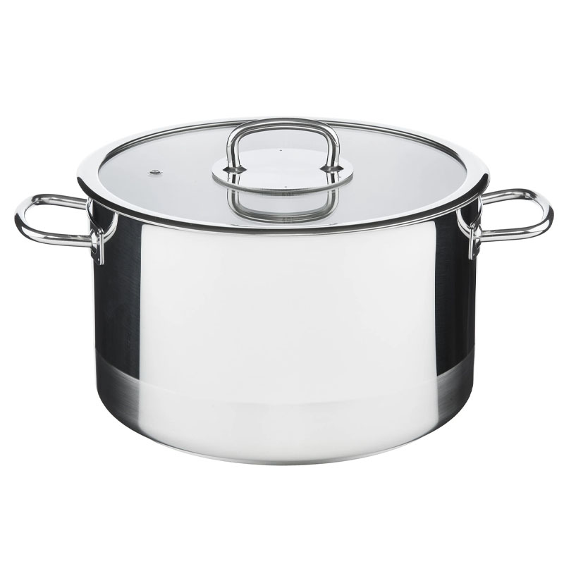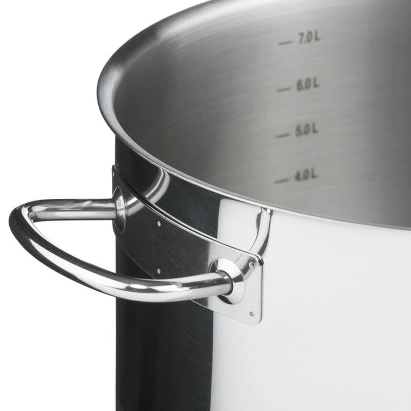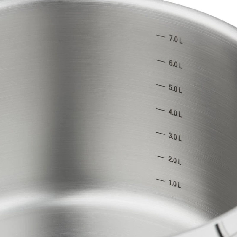 - 5-слойное капсульное дно (3 мм). Сердцевина из алюминия, запаянная между слоями стали, удерживает тепло ещё 10 минут после выключения плиты для томления без энергии.