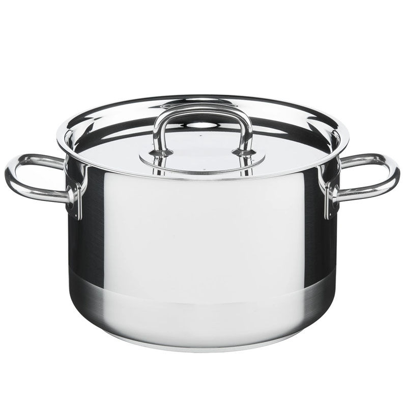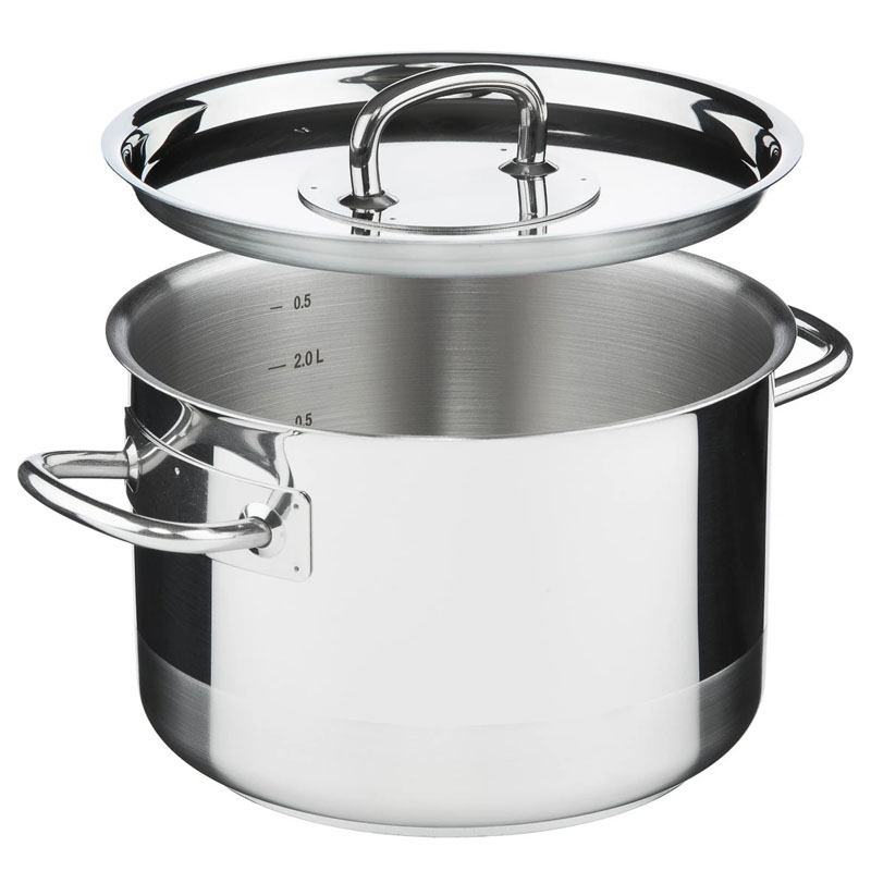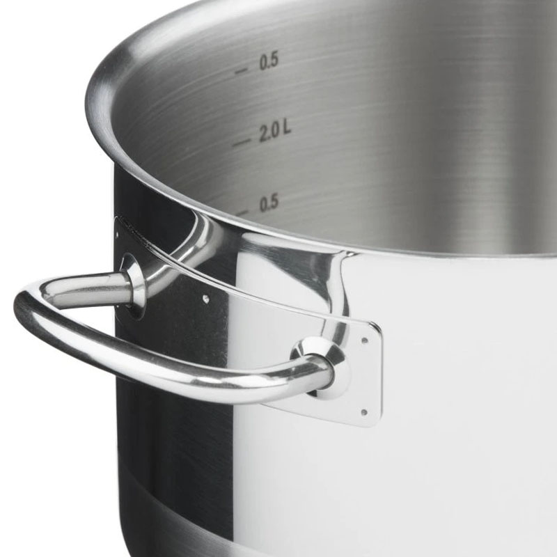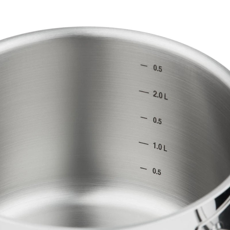- 5-слойное капсульное дно (3 мм). Сердцевина из алюминия, запаянная между слоями стали, удерживает тепло ещё 10 минут после выключения плиты для томления без энергии.