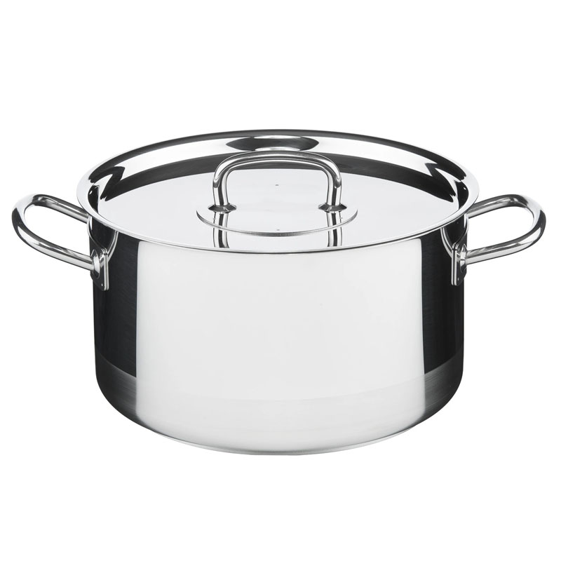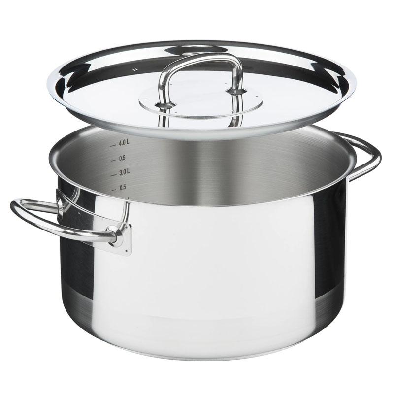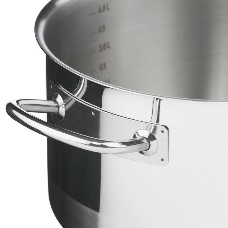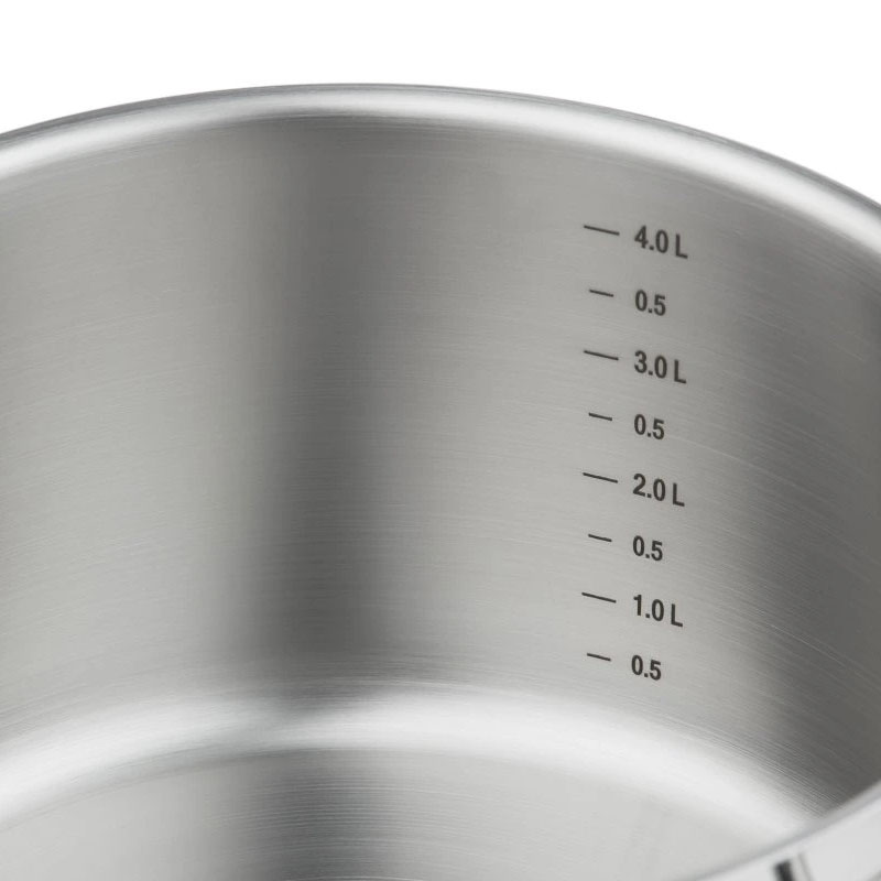 - 5-слойное капсульное дно (3 мм). Сердцевина из алюминия, запаянная между слоями стали, удерживает тепло ещё 10 минут после выключения плиты для томления без энергии.