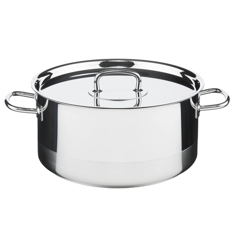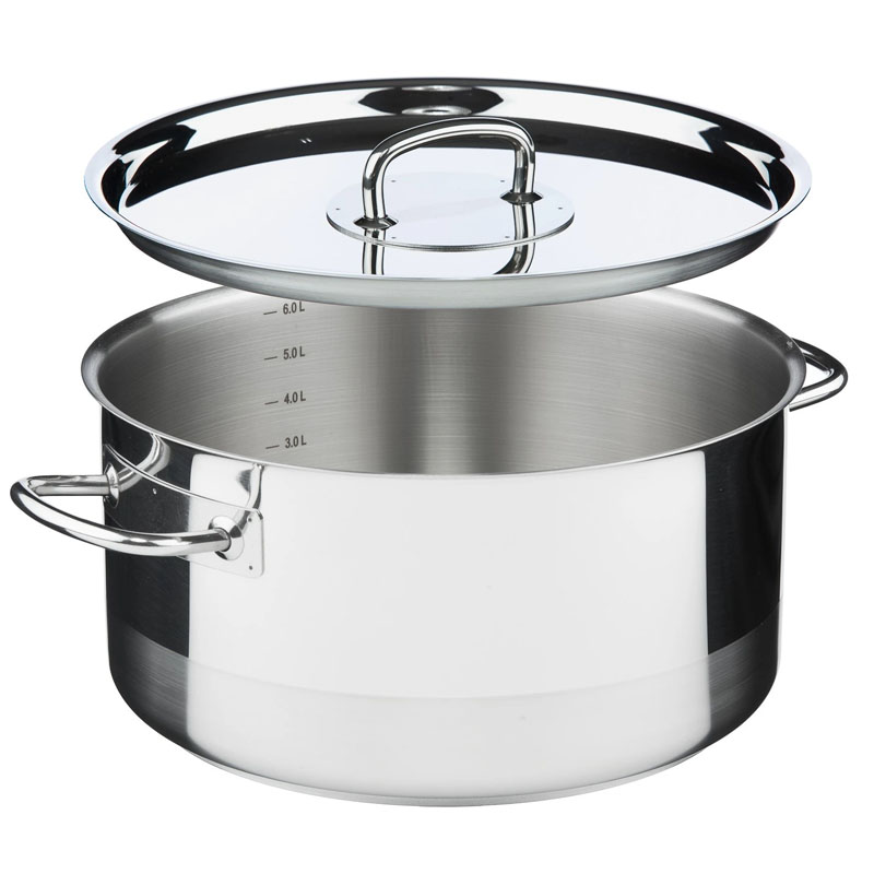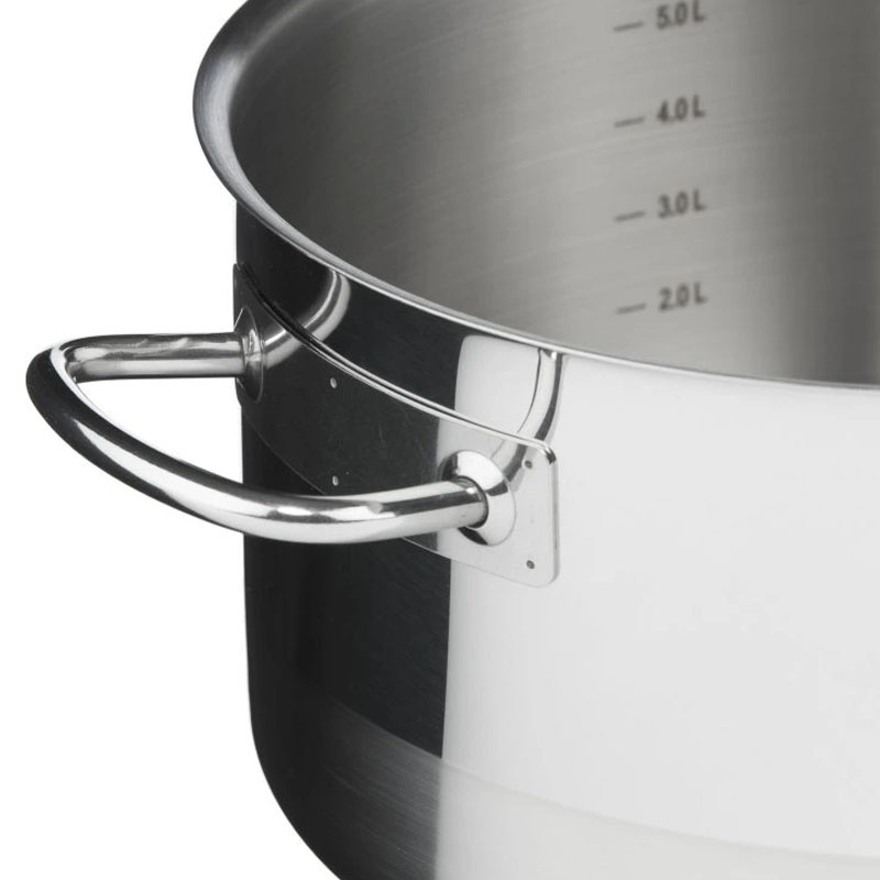 - 5-слойное капсульное дно (3 мм). Сердцевина из алюминия, запаянная между слоями стали, удерживает тепло ещё 10 минут после выключения плиты для томления без энергии.