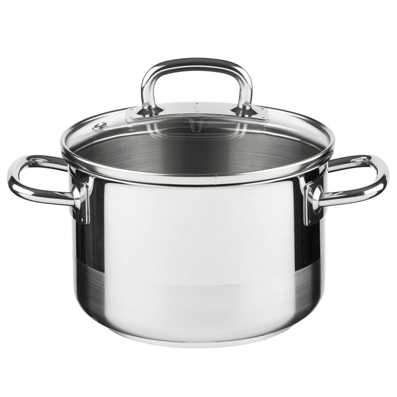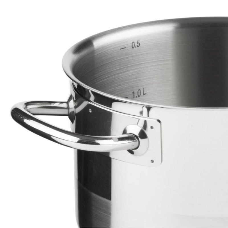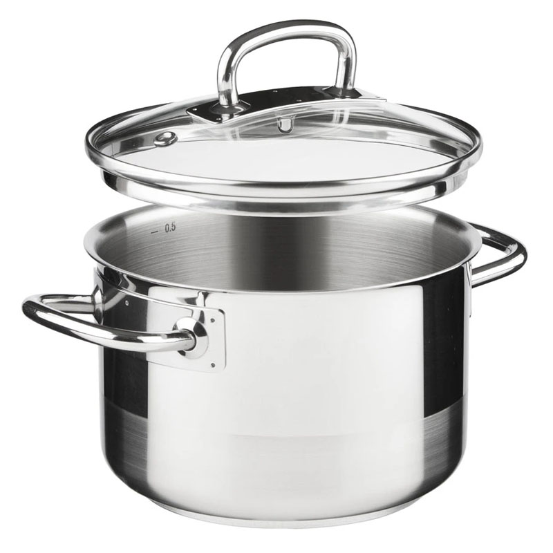 - 5-слойное капсульное дно (3 мм). Сердцевина из алюминия, запаянная между слоями стали, удерживает тепло ещё 10 минут после выключения плиты для томления без энергии.