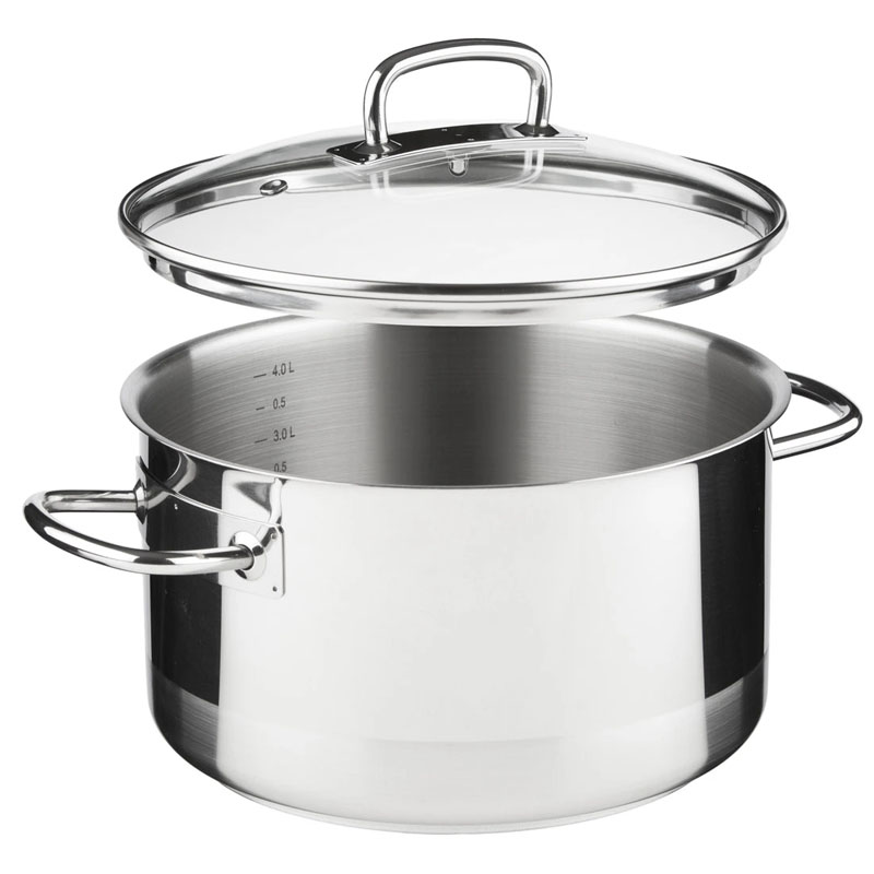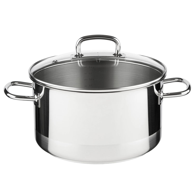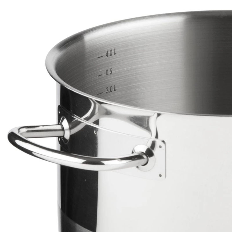 - 5-слойное капсульное дно (3 мм). Сердцевина из алюминия, запаянная между слоями стали, удерживает тепло ещё 10 минут после выключения плиты для томления без энергии.