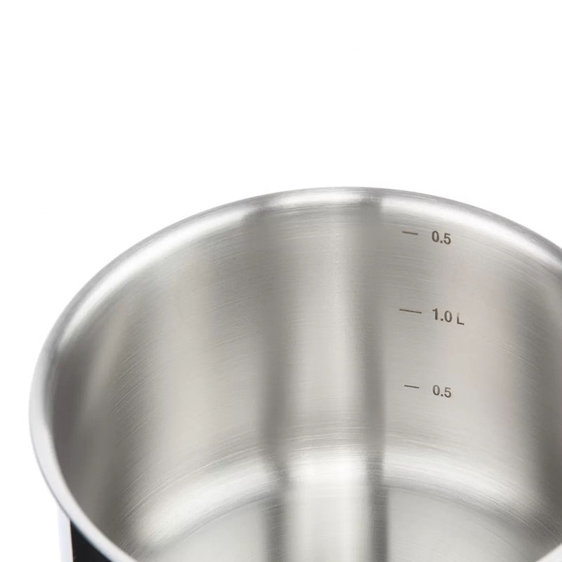 - 5-слойное капсульное дно (3 мм). Сердцевина из алюминия, запаянная между слоями стали, удерживает тепло ещё 10 минут после выключения плиты для томления без энергии.