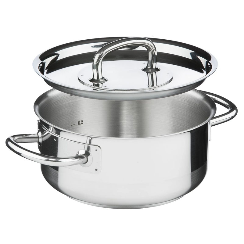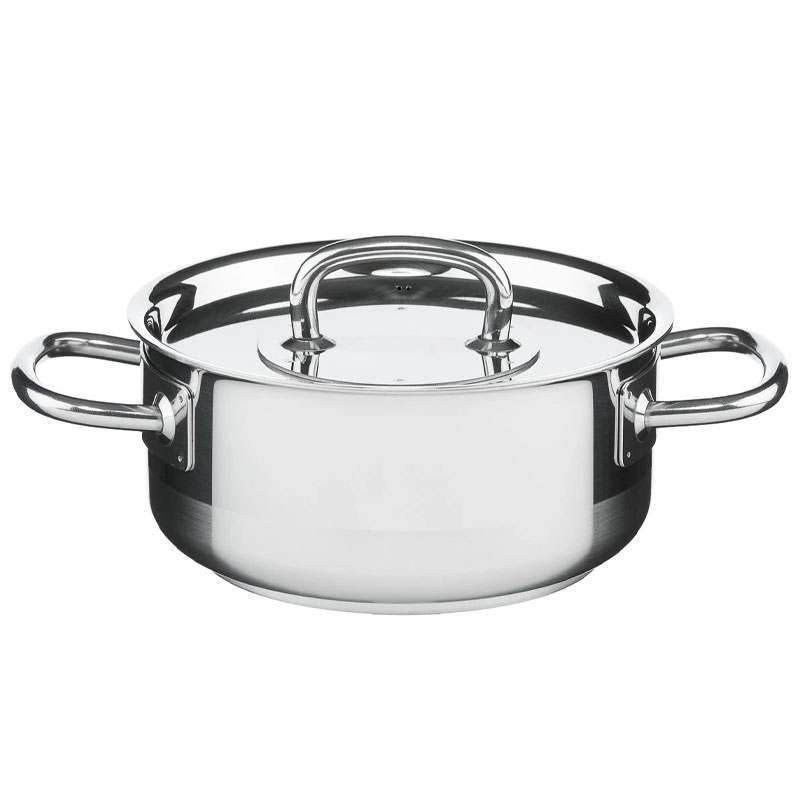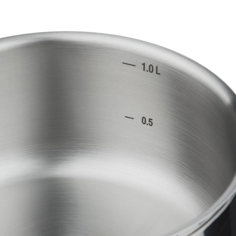 - 5-слойное капсульное дно (3 мм). Сердцевина из алюминия, запаянная между слоями стали, удерживает тепло ещё 10 минут после выключения плиты для томления без энергии.
