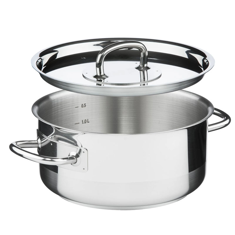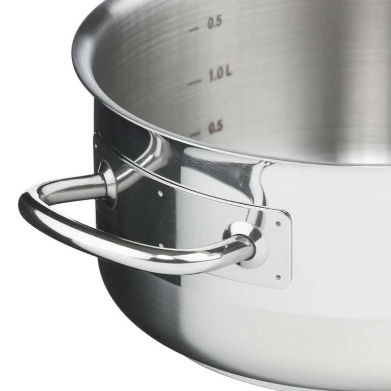 - 5-слойное капсульное дно (3 мм). Сердцевина из алюминия, запаянная между слоями стали, удерживает тепло ещё 10 минут после выключения плиты для томления без энергии.