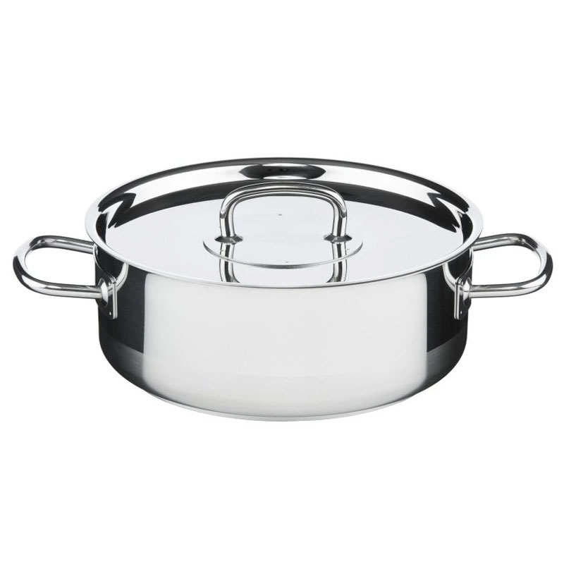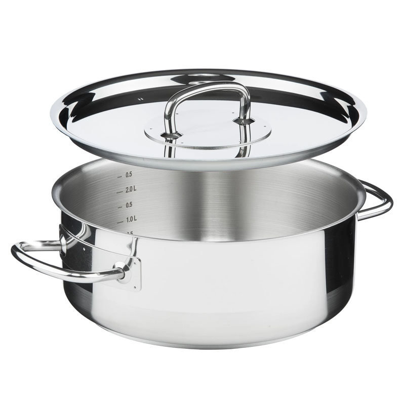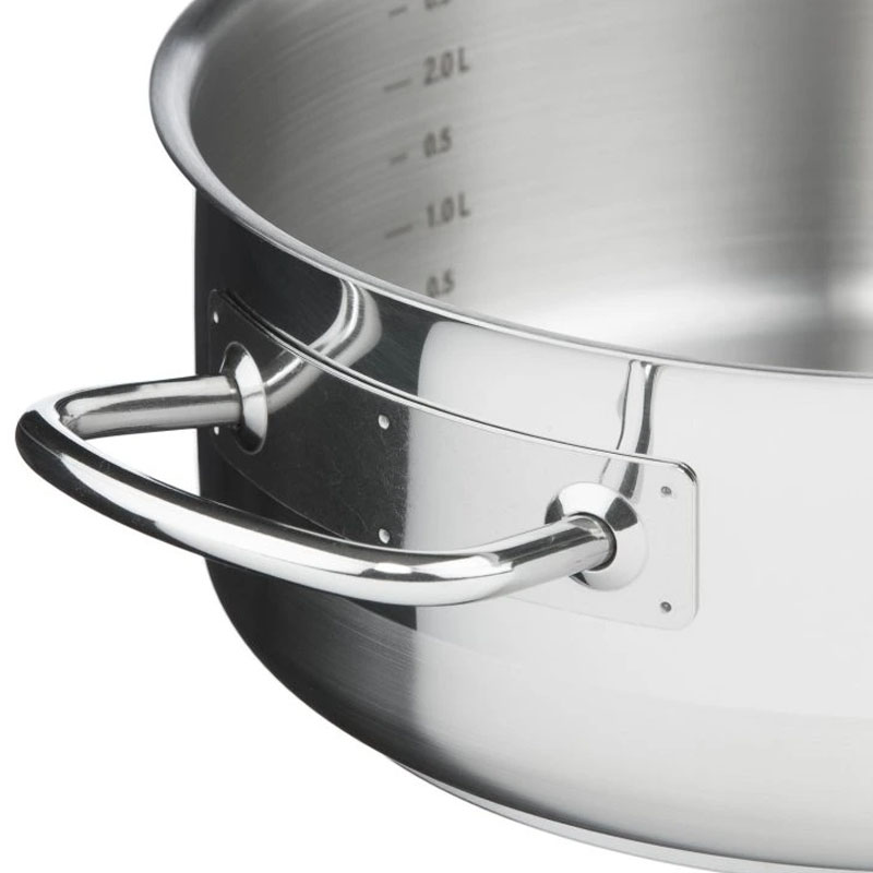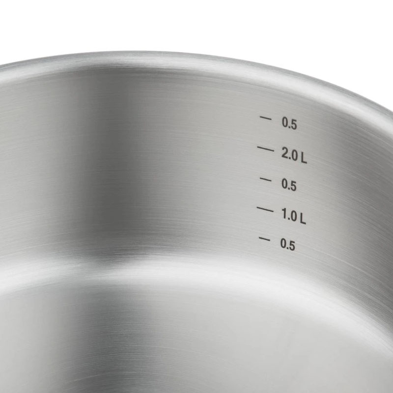 - 5-слойное капсульное дно (3 мм). Сердцевина из алюминия, запаянная между слоями стали, удерживает тепло ещё 10 минут после выключения плиты для томления без энергии.