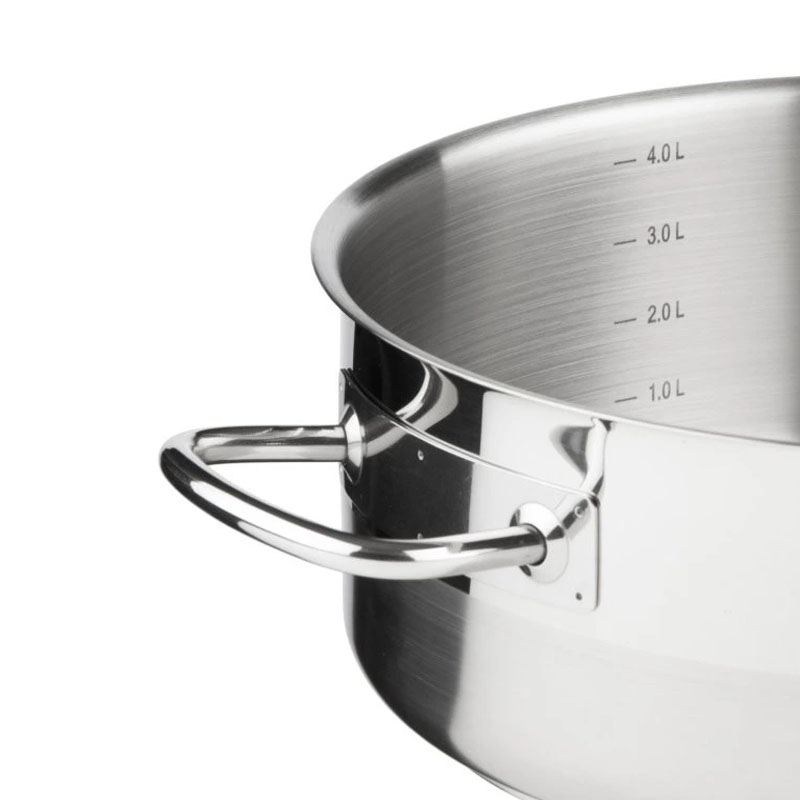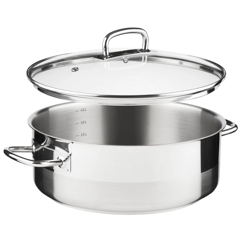 - 5-слойное капсульное дно (3 мм). Сердцевина из алюминия, запаянная между слоями стали, удерживает тепло ещё 10 минут после выключения плиты для томления без энергии.